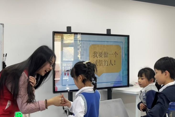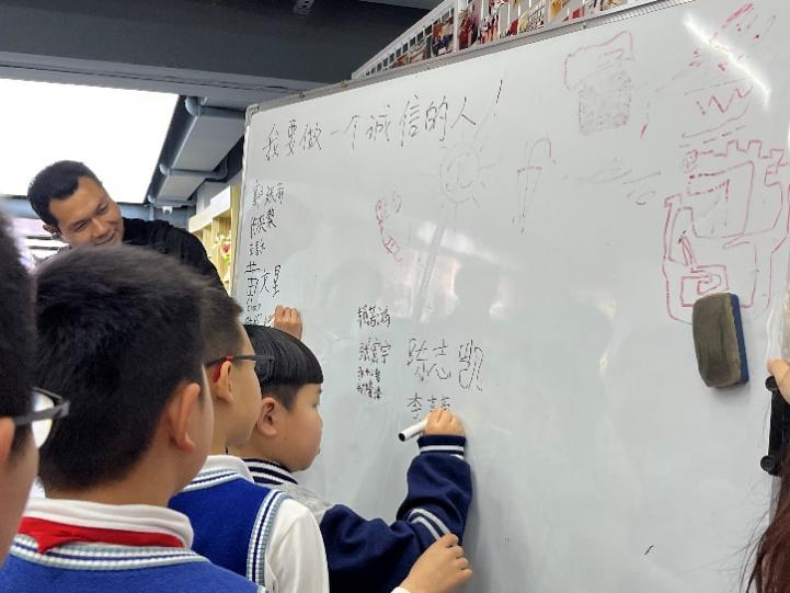 此外,普法员郭张雨还跟同学们互相拉钩,真诚地鼓励每一位同学在日常学习与生活中要讲诚信不撒谎。同学们跟随着普法员郭张雨的脚步在课堂的白板上写下了自己的姓名,共同许下了诚信做人的承诺。此次活动引发了同学们对诚信的思考,促进孩子们向诚信榜样学习,进一步提高了在场家长和同学们的诚信意识和法治素养。