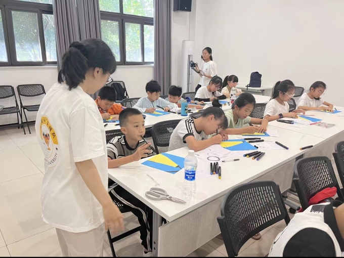 本次绘画课程主题是灯光下的街景。课堂上,实践队队员为孩子们分发绘画材料,老师为大家练习如何快速美观地画正方体、螺旋线、杭州亚运会图标等基础图案,给孩子们充分的时间用勾线笔进行练习。随后,老师认真讲解每一步绘画步骤中的细节,孩子们也听的非常认真,当PPT中展示最后成果图的时候,孩子们不由自主地赞叹,马上开始动手制作作品。虽然有些孩子在创作时有一些困难,但经过老师的细心讲解和手把手教学后,孩子们都进步飞快。