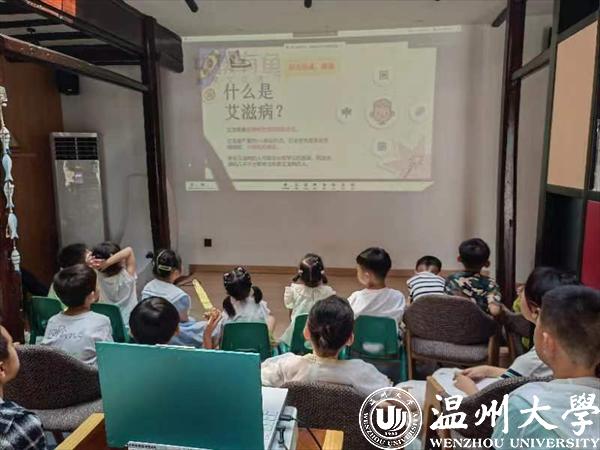 为了让孩子们更好地了解关于艾滋病的知识,使孩子们自发的传播有关艾滋病的正能量知识,呼吁他人了解和预防艾滋病,实践团成员为苍南县的孩子们带去了一堂艾滋病科普教育课——《艾滋病一点都不可怕!》。希望通过此课程的教学,能够让孩子们提高警惕,保护他们幼小的童心。课堂起始,实践团成员以一段视频导入,使孩子们对艾滋病有了基本的认识。接着老师介绍了艾滋病的初期症状:持续广泛性的淋巴结肿大,数周不明症状的发热发烧,难以解释的食欲下降、气促、干咳数周等,并让孩子们在生活中提高警惕。介绍过后,实践团成员采用小组讨论的方式提出问题,让孩子思考艾滋病危害有哪些,通过同桌或小组之间相互讨论的方式来帮助孩子加深记忆。