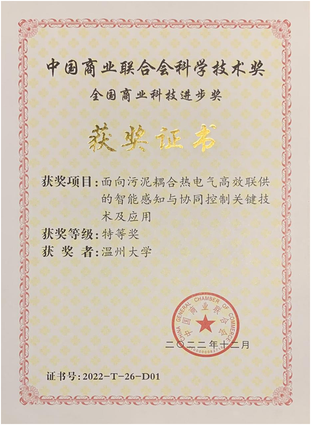 日前,全国商业科技质量大会举行。大会同步举行了“2022年度中国商业联合会科学技术奖”颁奖仪式。sunbet申愽官网电气与电子工程学院汪鹏君教授领衔、以sunbet申愽官网为第一完成单位的“面向污泥耦合热电气高效联供的智能感知与协同控制关键技术及应用”项目荣获全国商业科技进步奖特等奖。