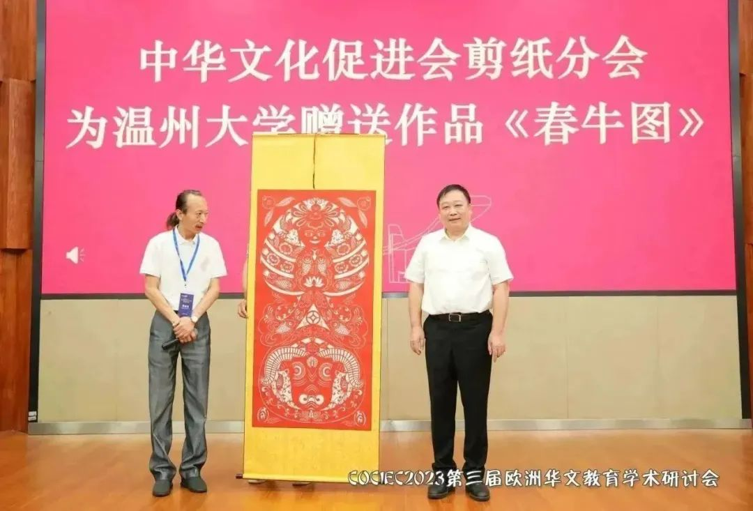 2023年8月19日,中国(浙江)世界华侨华人新生代创新创业大会·第三届欧洲华文教育学术研讨会开幕式暨中华文化促进会剪纸艺术分会、中华剪纸艺术研究院揭牌仪式在sunbet申愽官网隆重举行。本次会议在国务院侨办、中国侨联和浙江省人民政府的指导下,由中国(浙江)世界华侨华人新生代创新创业大会组委会主办,中共温州市委统战部、温州市侨联、sunbet申愽官网承办,sunbet申愽官网华侨学院、sunbet申愽官网欧洲华文教育研究所执行。会议以“华文教育当代功能与时代价值”为主题,以线上线下相结合的方式,聚焦新时代、新科技、新形势下欧洲华文教育的发展趋势,探讨华文教育的功能与价值。