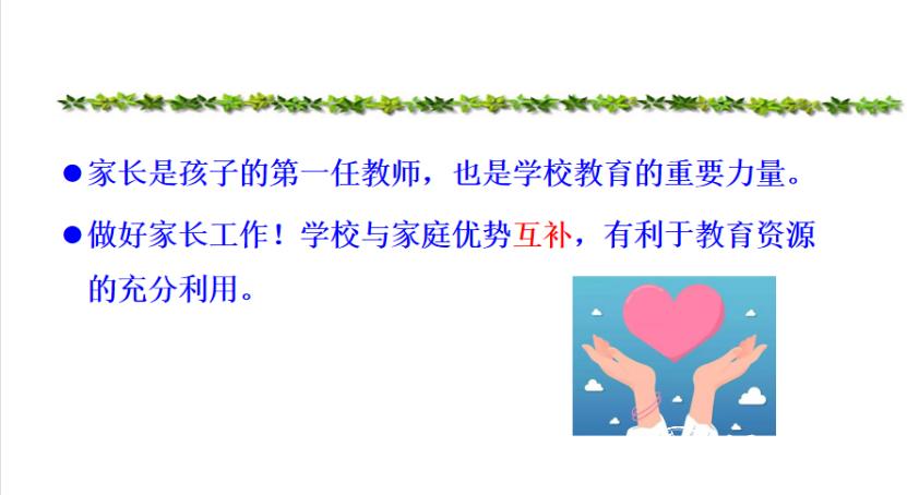 周老师提到,家校联系就像一根纽带,家校联系就像一颗催化剂,潜移默化中,将孩子、家长、老师的心相连,让孩子、家长、老师的情感融合。家长是孩子的第一任教师,也是学校教育的重要力量。做好家长工作!学校与家庭优势互补,有利于教育资源的充分利用。教育的有效性不仅在于教育内容的正确性,更在于沟通的有效性。在家校沟通中,教师应密切注意与家长的关系,赢得了家长的理解、支持,更好地阐扬家庭蕴藏的教育资源,使家长的介入意识、角色认识、教育观念等真正实现多角度、全方位、深条理的家校互动,提高了家校同步教育的有效性,共同增进了学生的成长,这也将成为我们提高教育质量的重要资源。