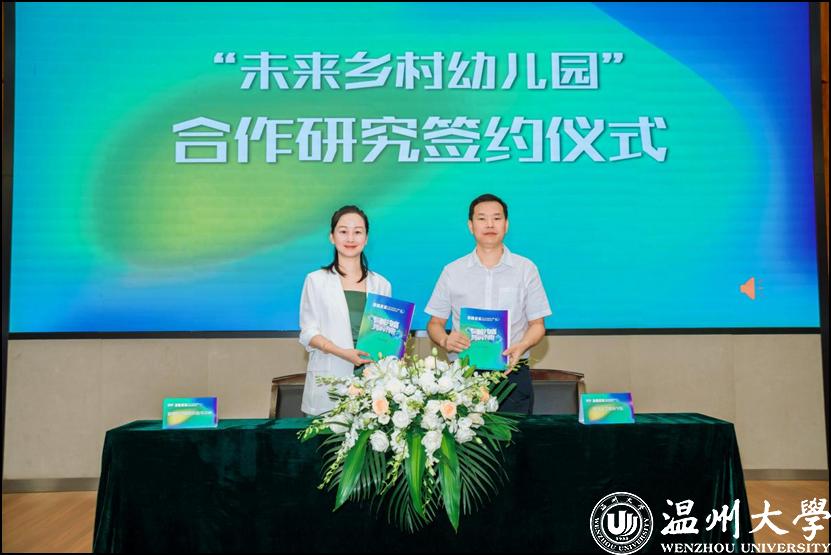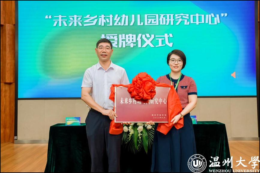 市学前教育指导中心主任陈苗和sunbet申愽教育学院党委书记何毅分别代表市学前教育指导中心和sunbet申愽教育学院进行“未来乡村幼儿园”合作研究签约。温州市教育局在sunbet申愽教育学院设立“未来乡村幼儿园研究中心”并向院方代表授牌。