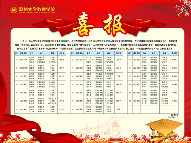 日前,从大学生数学建模竞赛全国评委会传来喜讯,sunbet申愽官网在2023高教社杯全国大学生数学建模大赛中获全国二等奖2项。在经过省级与国家级两阶段会评后,除以上2项全国二等奖,sunbet申愽官网还获得省一等奖2项、省二等奖7项、省三等奖9项的好成绩。
