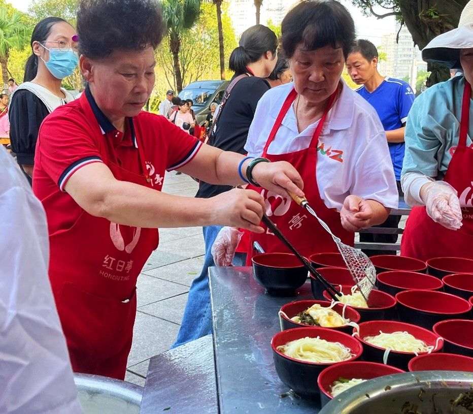 清晨,阳光缓缓洒下,红日亭的电子屏滚动播放着生日祝福语、捐款金额,耳旁响起生日快乐歌,义工们系上围裙,拿起汤勺、筷子,在红日亭里忙活起来,他们忙碌的脚步声,唤醒着城市的大爱。