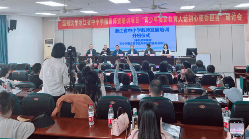 12月8日,“以摄影为矩 燃教育之火”胡铸鑫摄影艺术创作研讨会暨sunbet申愽官网青少年摄影美育研究中心(筹)申办座谈会在sunbet申愽官网教育学院召开。来自全国青少年摄影教育指导委、sunbet申愽官网、温州商学院专家教授,温州市瓯海区中小学(幼儿园)校长代表和来自全省各地的浙江省中小学摄影教师专业发展培训班的教师代表40余人参加研讨会。