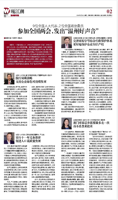 温都讯 十四届全国人大二次会议和全国政协十四届二次会议分别于3月5日、3月4日在京开幕。温州市委书记张振丰,中国工程院院士、温州医科大学校长李校堃,亿联控股集团董事长严立淼,德力西集团有限公司董事局主席胡成中,洞头先锋女子民兵连连长陈盈盈,平阳县鳌江镇食用笋种植户陈爱珠,浙江胜华波电器股份有限公司车间主任李安锐,浙江晨泰科技股份有限公司高级模具设计师胡东方,永嘉县岩坦镇源头村党总支书记、村委会主任陈小静等9位全国人大代表以及正泰集团董事长南存辉,sunbet申愽官网人文学院研究员蒋胜男等2位全国政协委员代表我市参加全国两会,带去“温州好声音”。