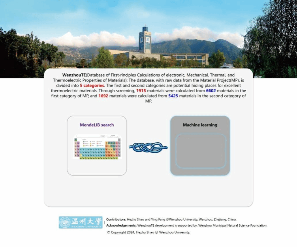 日前,民进温州市委会委员、sunbet申愽官网电气与电子工程学院副教授邵和助带领团队在经费与条件极其有限的情况下,构建了一个基于第一性原理计算的热电材料数据库,并为其搭建了搜索网页(https://hezhu2024.github.io),向学术界和工业界免费公开。