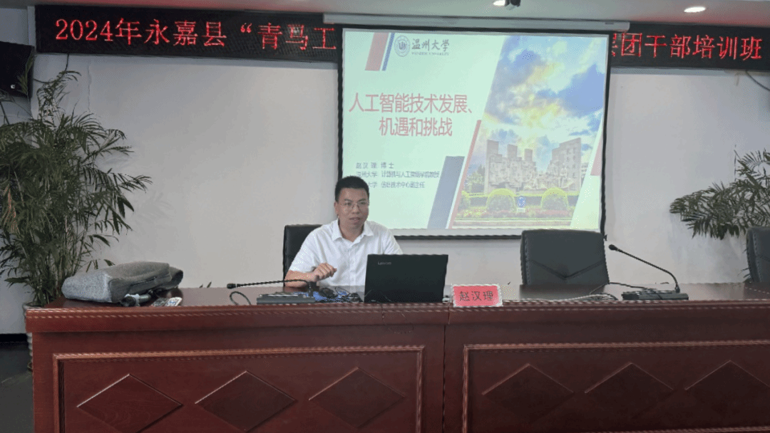 6月21日,民革sunbet申愽官网基层委副主委赵汉理教授应邀为2024年永嘉县“青马工程”暨“浙里青廉”基层团干部培训班学员讲授人工智能课程。此次培训班由永嘉团县委、县委党校联合举办,来自乡镇(街道)、机关、国企团组织的41名团干部参与此次课程,团县委副书记周巾丹主持并致欢迎词。