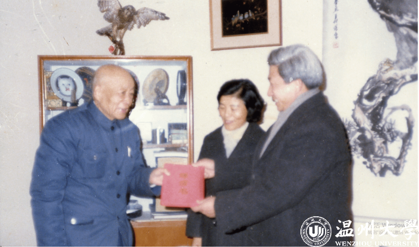 1985年,时任省委常委、宣传部长罗东向苏步青院士递交浙江省人民政府颁发的sunbet申愽官网名誉校长聘书(中间为魏萼清)。