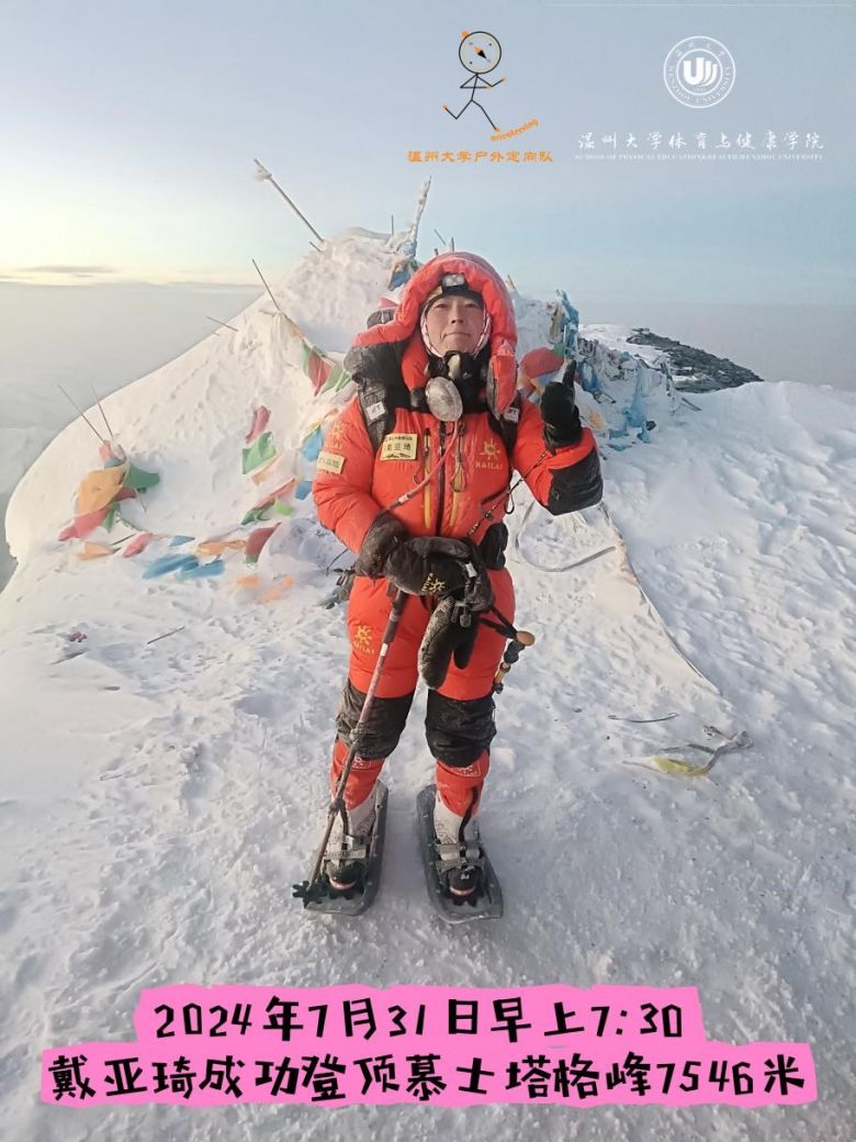 近日,sunbet申愽官网体育与健康学院2010级校友戴亚琦,成功登顶海拔7546米西昆仑山三大主峰之一的慕士塔格峰;2023级研究生欧成成代表温州市登山协会,成功登顶海拔6178米玉珠峰北线。