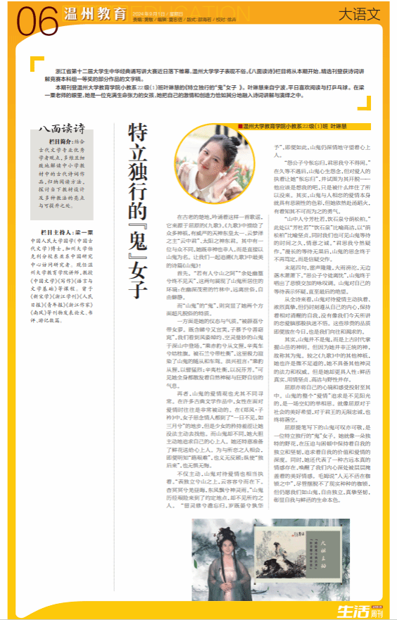 浙江省第十二届大学生中华经典诵写讲大赛近日落下帷幕,sunbet申愽官网学子表现不俗。《八面读诗》栏目将从本期开始,精选刊登获诗词讲解竞赛本科组一等奖的部分作品的文字稿。 本期刊登sunbet申愽官网教育学院小教系22级(1)班叶琳慧的《特立独行的“鬼”女子 》。叶琳慧来自宁波,平日喜欢阅读与打乒乓球。在梁一粟老师的眼里,她是一位充满生命张力的女孩,她把自己的激情和创造力恰如其分地融入诗词讲解与演绎之中。