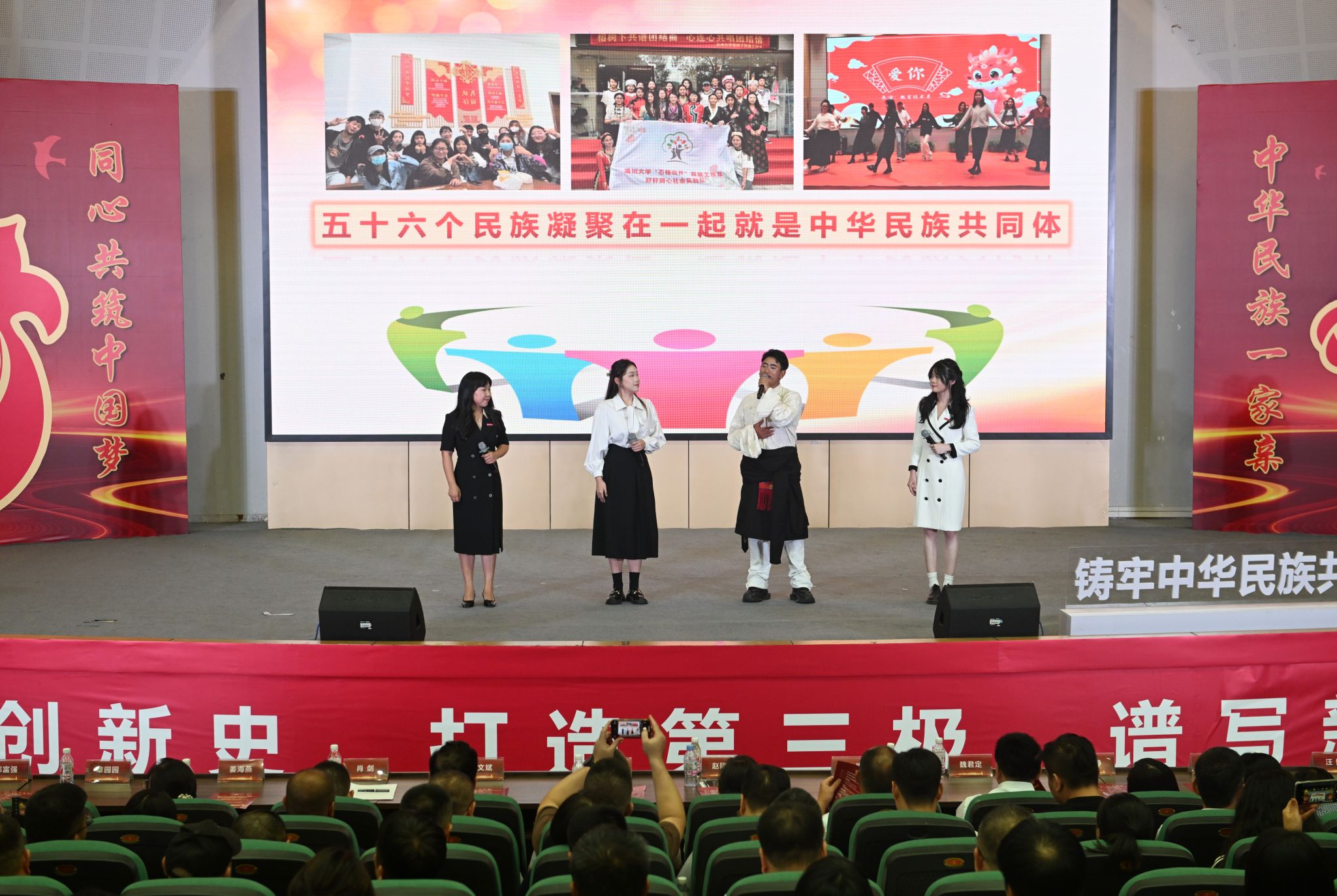 sunbet申愽教育学院23学前教育(中本一体化)学生倪心倚以《青春奔“榴” 民族情厚》为题,分享了自己对铸牢中华民族共同体意识的认识和理解。sunbet申愽官网“石榴花开”民族工作室负责人、教育学院党委副书记章园园、人文学院21级藏族学生伟色加布、教育学院22应心于璟玥、教育学院辅导员王伊如讲述《石榴花儿朵朵开·启航筑梦新时代》。这一故事从伟色加布成长、求学的真实经历切入,讲述了sunbet申愽民族工作五位一体的中华民族共同体意识教育体系,展示了“五十六个民族像石榴籽一样紧紧抱在一起”的深厚情谊和感人事迹。