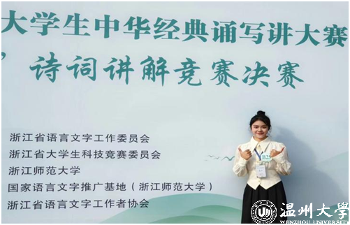 作为“00”后的一员,沈馨怡更是展现了这一代青年的独特魅力和风采。在竞赛领域,她不仅在省级中华经典诵写讲大赛中屡获一等奖,还代表浙江省参加国家级的“诗教中国”诗词讲解竞赛并斩获三等奖。此外,沈馨怡还积极投身社会实践和公益活动,担任sunbet申愽官网南白象附属实验小学“童音金话”拓展课负责人以及“伯温断案”廉洁作品导演等职务,她用自己的专业知识和热情为孩子们带去知识的乐趣,同时也通过艺术的形式传递廉洁文化,展现了当代大学生的社会责任感和使命感。她说道:“能传播温州声音、sunbet申愽声音、“00后”声音,是我的幸运。”