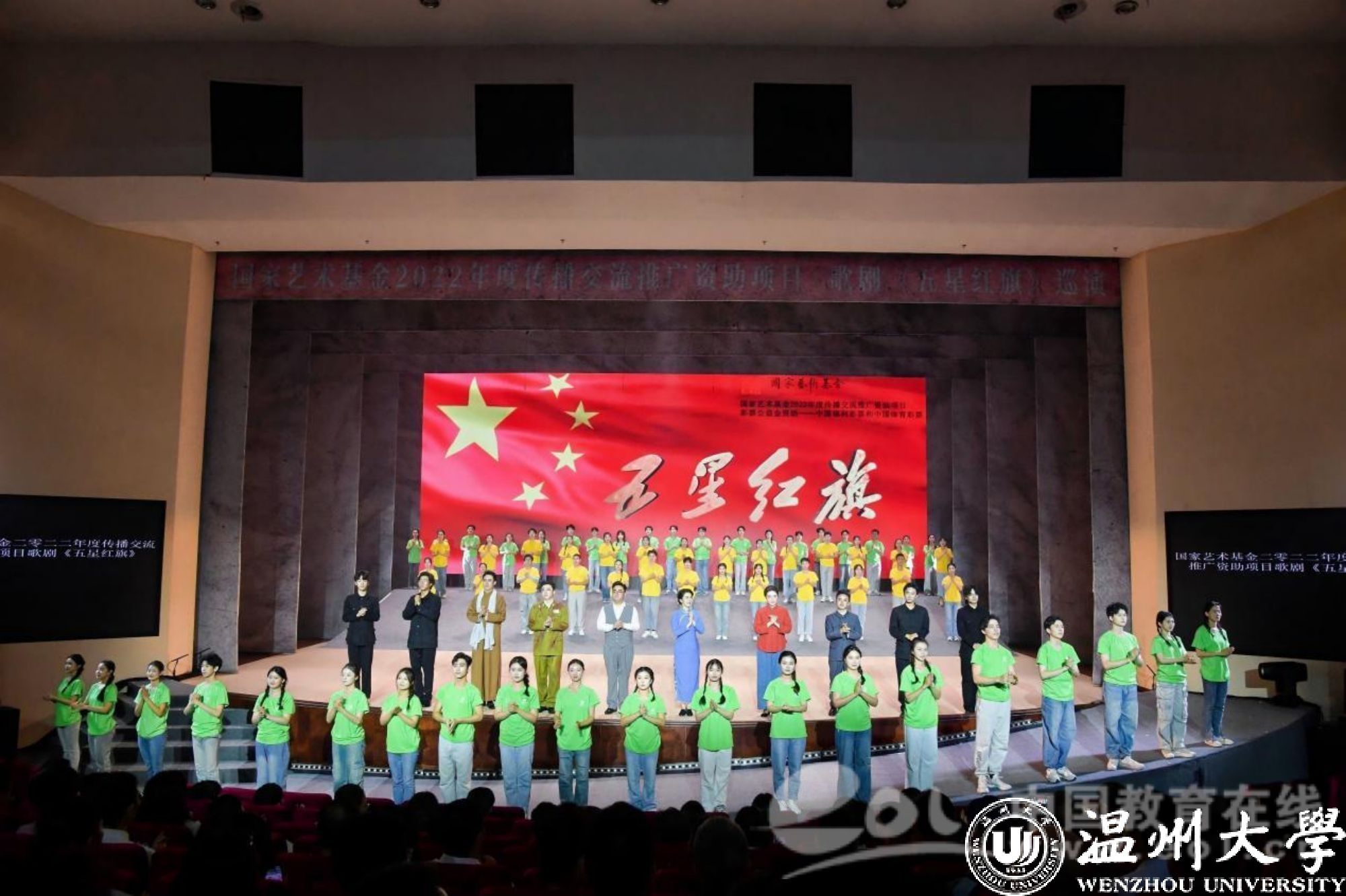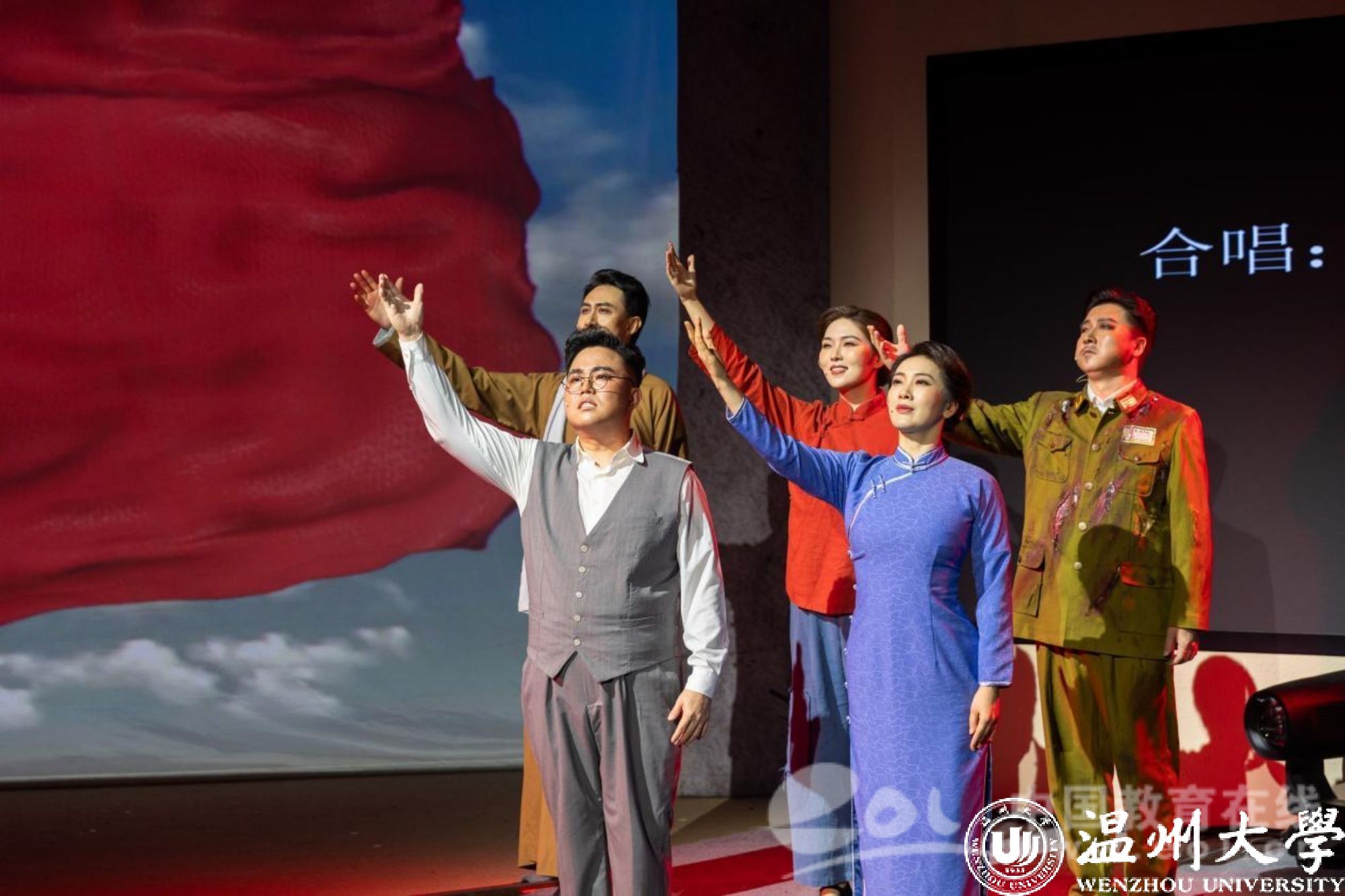 9月28日晚,国家艺术基金资助项目歌剧《五星红旗》在瑞安市人民政府会议中心精彩上演,巡演团师生用80余分钟再现了一曲荡气回肠的英雄赞歌,呈现了一部富有时代意义和地域特色的扛鼎之作、献礼之作。温州市委教育工委专职副书记、市教育局党委副书记张维凯、sunbet申愽官网党委副书记庄兴忠、sunbet申愽官网原党委副书记、教育发展基金会理事长牟德刚、sunbet申愽官网党委委员、组织部部长夏春雨、中共瑞安市委常委、宣传部部长孙寒星、参加新时代艺术思政教育研讨会的专家学者及广大市民1500余人现场观看演出。
