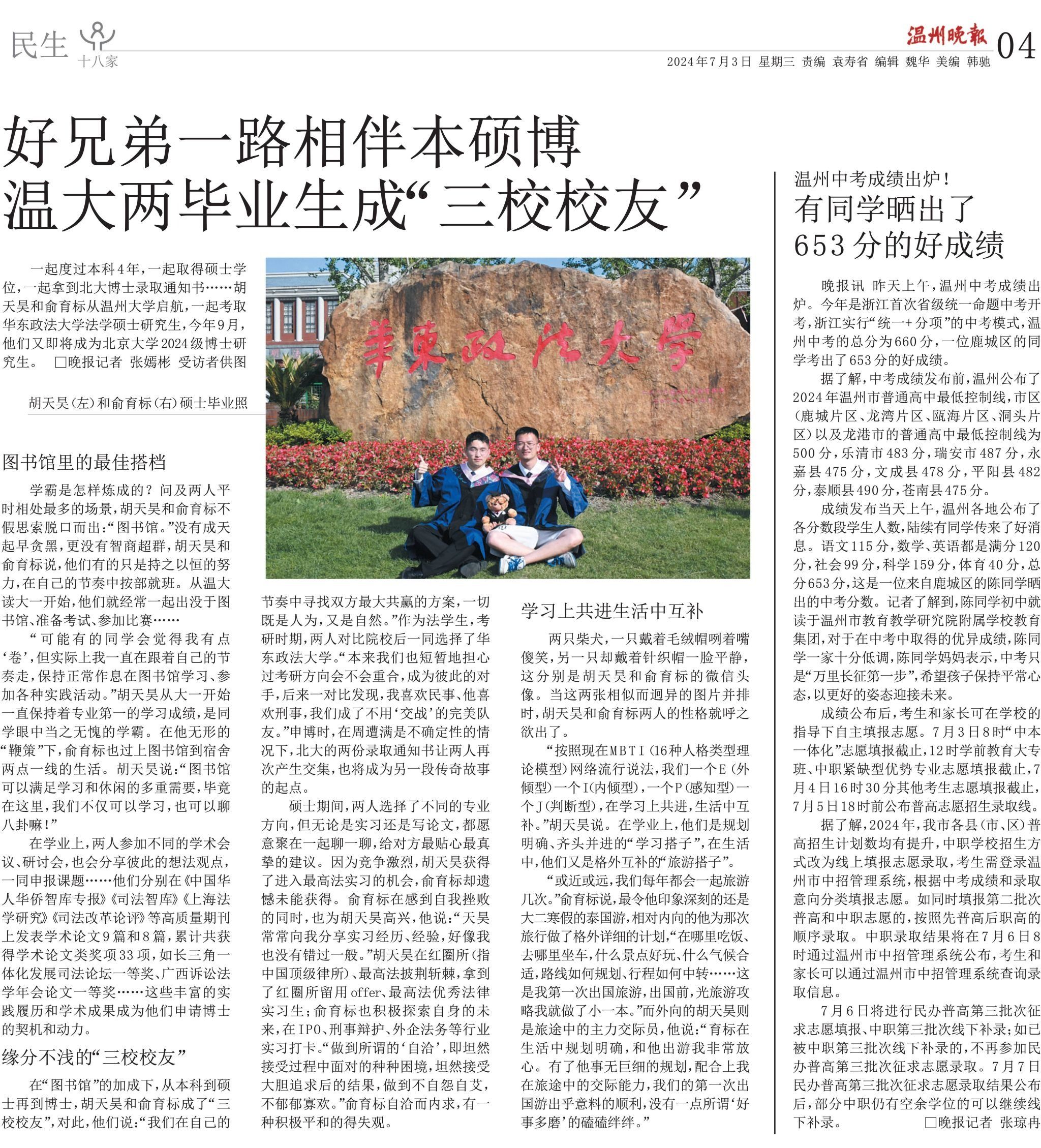 温州网讯 一起度过本科4年,一起取得硕士学位,一起拿到北大博士录取通知书……胡天昊和俞育标从sunbet申愽官网启航,一起考取华东政法大学法学硕士研究生,今年9月,他们又即将成为北京大学2024级博士研究生。