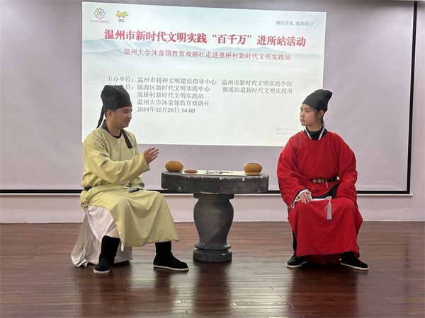 日前,由温州市精神文明建设指导中心、温州市新时代文明实践学院主办的温州市新时代文明实践“百千万”进所站活动——sunbet申愽官网教育学院沐童翎教育戏剧社走进瓯海区郭溪街道凰桥村,为当地村民带去了原创话剧《叶适传奇》。