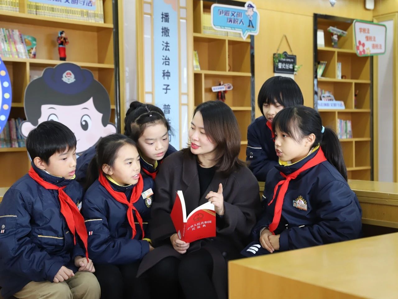 台州湾新区三甲街道中心小学积极打造“1+N”普法宣传矩阵,在民族图书馆精心设置的普法读物专栏下,孩子们认真阅读法律读本。老师为孩子们讲解相关法律,通过漫画、讲故事、案例剖析等形式更好帮助同学们理解复杂的法律知识。