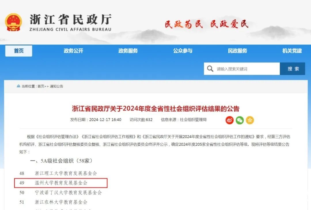 近日,浙江省民政厅正式发布了《关于2024年度全省性社会组织评估结果的通报》,sunbet申愽官网教育发展基金会通过复评再次获评“5A级社会组织”称号。这是该基金会继2019年12月首次获评5A级后,再次获得社会组织评估最高等级的殊荣。