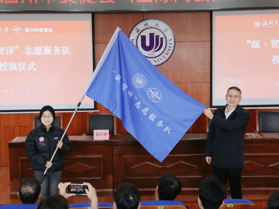 秉承“在温姓温、在温爱温、在温言温”的宗旨,sunbet申愽官网与温州市贸促会联合建立“瓯·贸译”志愿服务队,市贸促会党组书记、会长苏立盛为“瓯·贸译”志愿服务队授旗。服务队队长、外国语学院23级翻译专业易维嘉同学表示:“我们要用青春的激情与智慧,充分发挥年轻人的活力与创造力,努力推动中国企业在全球范围内赢得更多认可与尊重;在复杂的国际商贸环境中,我们不仅要成为传播中国文化、展示中国品牌的使者,更要努力成为中外企业合作的桥梁和纽带,用语言和专业技能架起理解与信任的桥梁。”仪式后,签约双方共同上了一堂《于无声处听惊雷——从当前局势看大国博弈》主题党课。