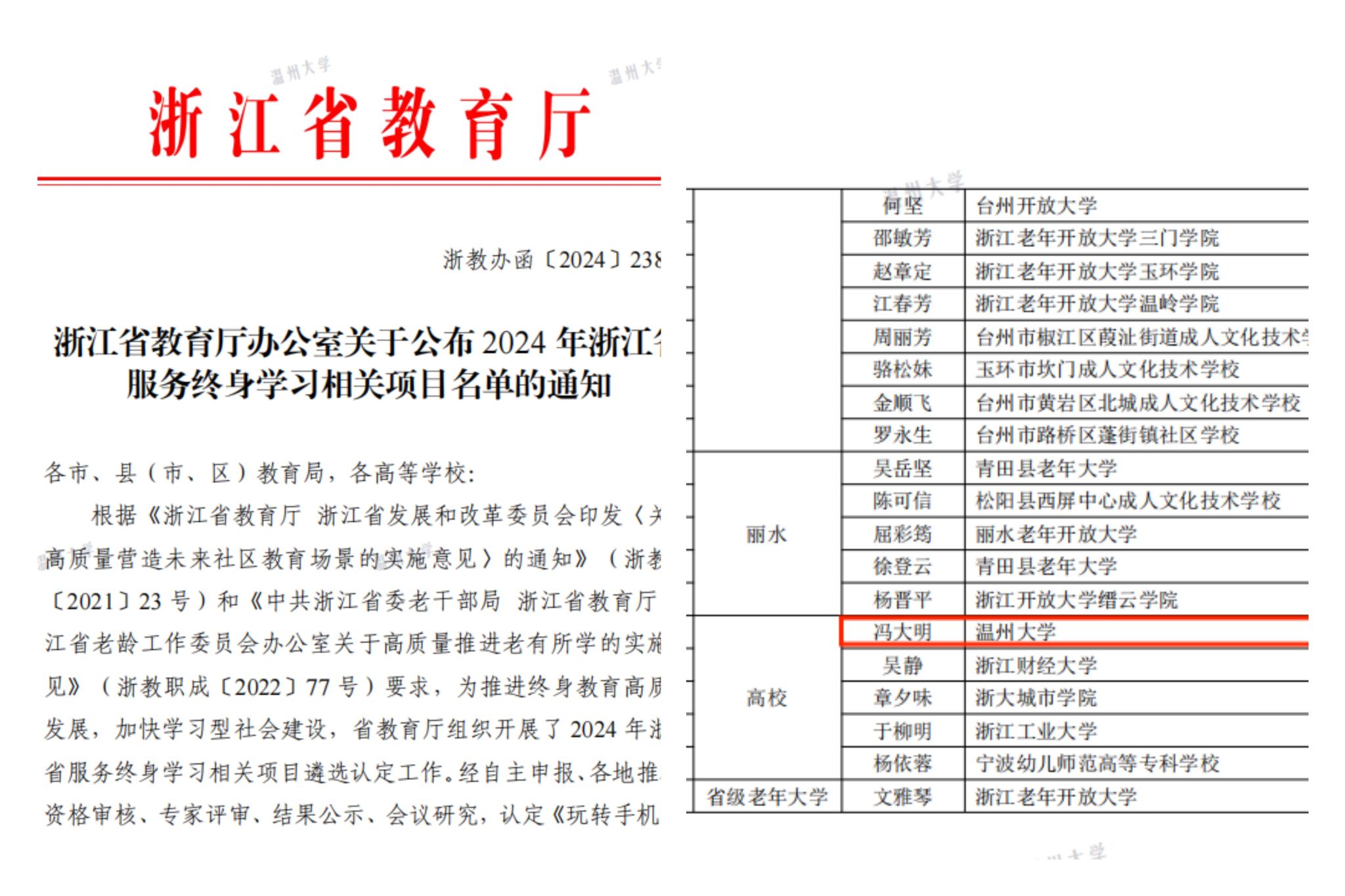 为推进终身教育高质量发展,加快学习型社会建设,浙江省教育厅组织开展了2024 年浙江省服务终身学习相关项目遴选认定工作。近日,2024年浙江省服务终身学习相关项目认定结果公布,sunbet申愽官网退休干部冯大明成功入选 “浙里美” 老年学习达人。