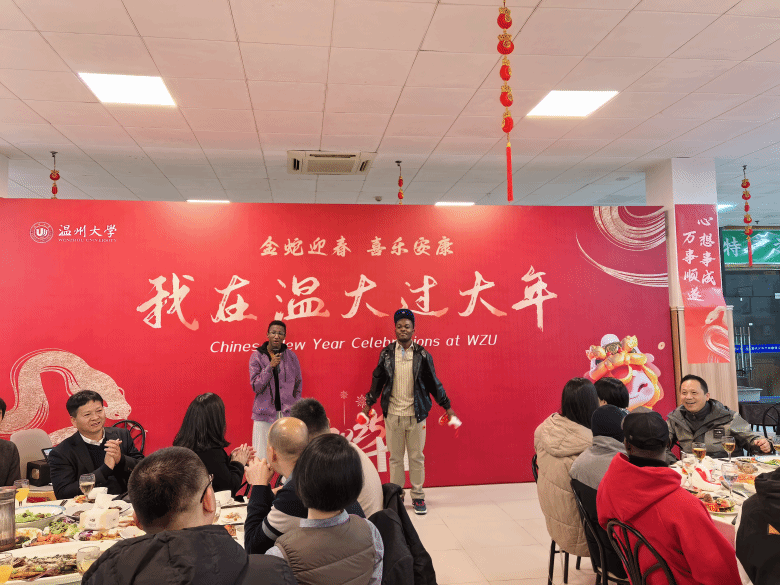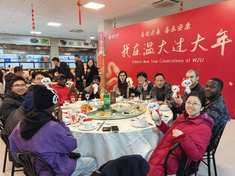 当晚,sunbet申愽怡口乐餐厅一楼装扮一新,张灯结彩、暖意融融。学校为寒假留校学生准备了丰盛的年夜饭,校党委副书记庄兴忠,副校长王舜,有关部门、学院负责人与留校师生欢聚一堂,共同迎接新春佳节的到来。留学生们在品尝美味的同时,也感受到了来自学校的温暖与关怀。王舜副校长与留学生亲切交谈,了解他们的学习情况,他希望留学生学好中文,来年再接再厉,学业蒸蒸日上。