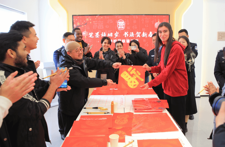 1月14日,国际教育学院与茶山派出所共同举办了以“笔墨辞旧岁,书法贺新春”为主题的特色活动。活动现场,墨香四溢。在专业书法老师的指导下,留学生们兴致勃勃地拿起毛笔,蘸满浓墨,一笔一划地书写着“福”字和春联。他们虽然初涉书法,但每个人都全神贯注,力求将每一个字都写得工整美观。写完后,他们还纷纷展示自己的作品,脸上洋溢着满足和喜悦的笑容。活动后来自乌兹别克斯坦的留学生娜美感慨的说:“春联上的每一个字都蕴含着吉祥和美好的寓意,这让我深刻体会到了中国人对和谐、好运的追求。这次体验让我更加热爱中国文化了。”