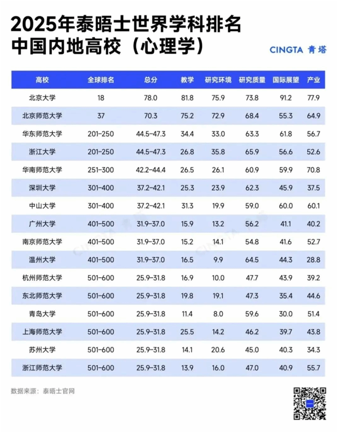 2025年泰晤士高等教育世界学科排名重磅发布,其中,sunbet申愽官网心理学专业位列中国内地高校第10名,全球排名约401-500位,这是sunbet申愽心理学系近年来在国际权威排名中的最佳成绩。