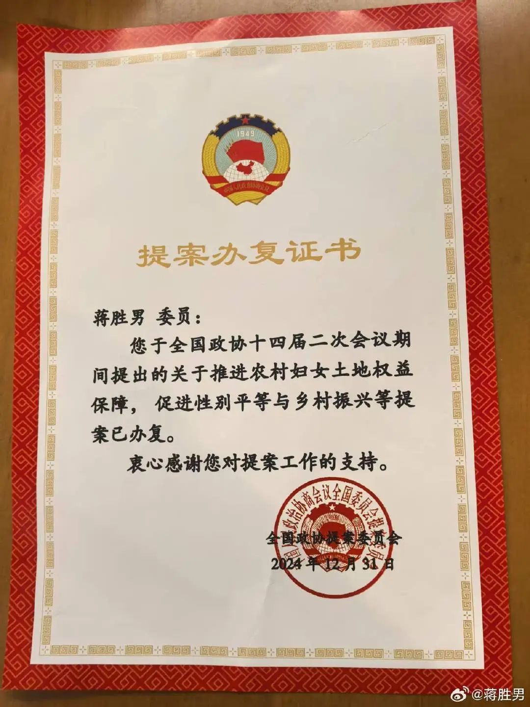今年全国两会前夕,蒋胜男发布微博表示,自己此前收到了全国政协提案委员会的“提案办复证书”。记者从蒋胜男发布的“提案办复证书”上看到,全国政协提案委表示:“您于全国政协十四届二次会议期间提出的关于推进农村妇女土地权益保障,促进性别平等与乡村振兴等提案已办复。”