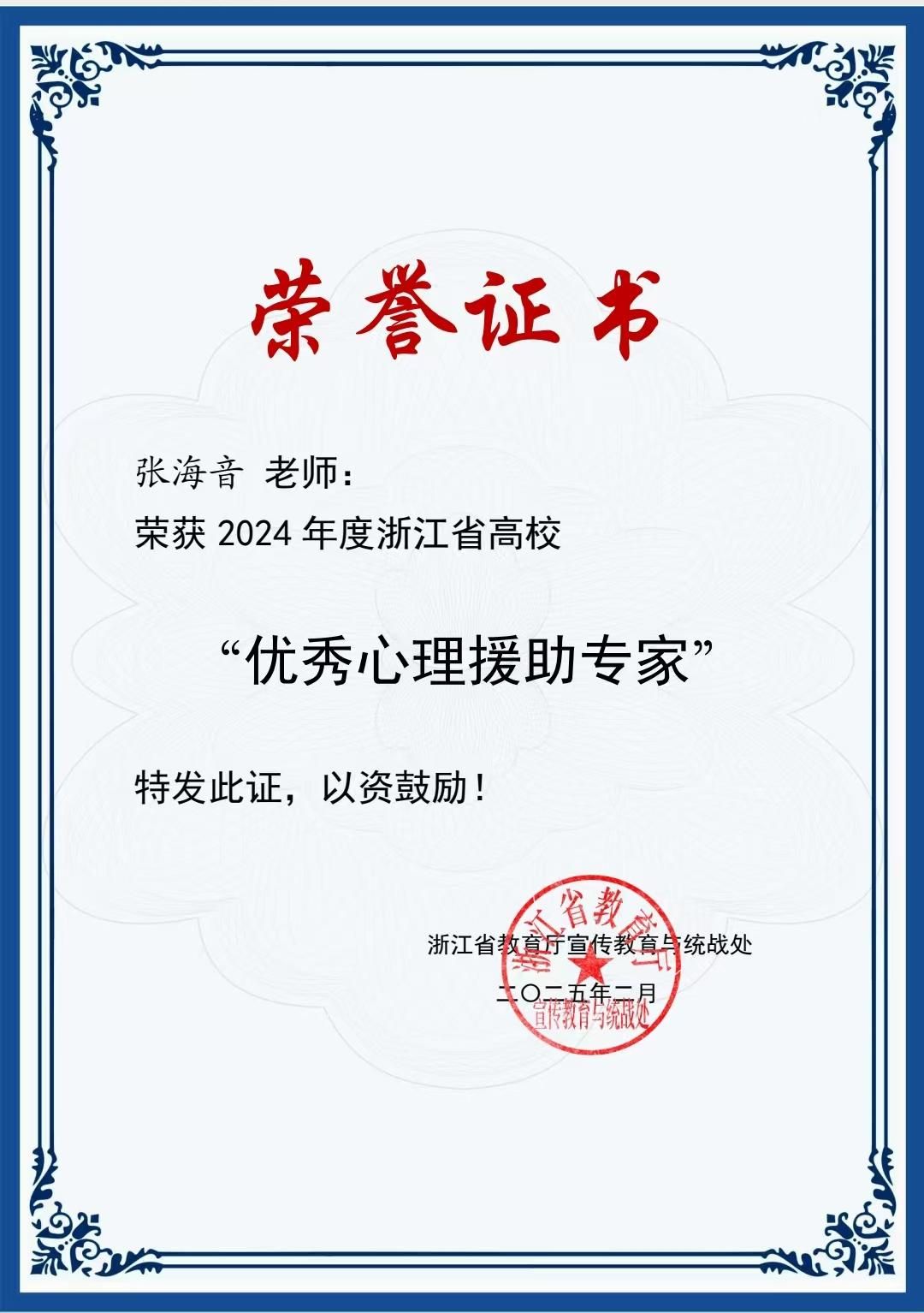 近日,2024年度浙江省高校“优秀心理援助专家”评选结果揭晓,sunbet申愽官网退休教师张海音副教授从全省专家中脱颖而出,获评浙江省高校“优秀心理援助专家”。