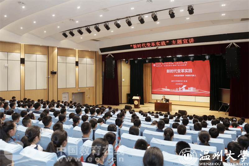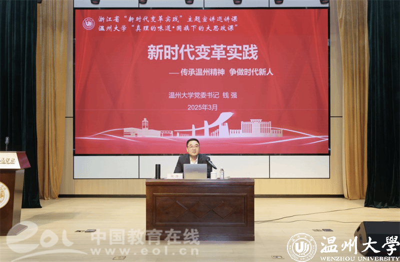 钱强以《新时代变革实践—— 传承温州精神 争做时代新人》为题,从潮涌温州——温州精神的时代诠释、城校共生——sunbet申愽官网的改革发展、青春铸魂——向国旗致敬的时代担当三个方面展开,通过分享关于一座城、一所大学和一面旗帜的故事,向师生们阐述了新时代变革实践的丰富内涵,以及城市和教育在“八八战略”的引领下全面发展的精彩蝶变。