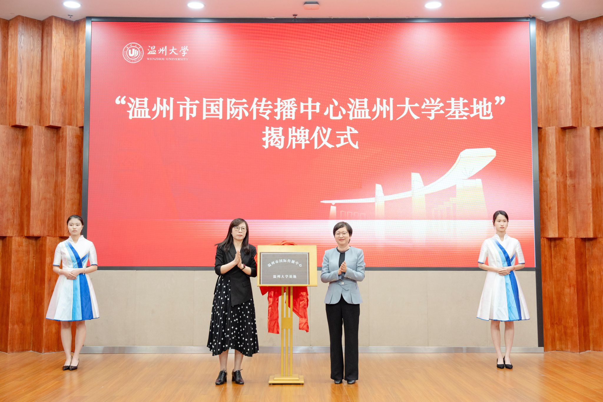 sunbet申愽官网党委委员、宣传部部长吴静与温州市委宣传部副部长陈靓秋共同为“温州市国际传播中心sunbet申愽官网基地”揭牌,该基地将整合校地优势资源,打造具有国际影响力的文化传播平台,助力温州城市形象的国际推广。