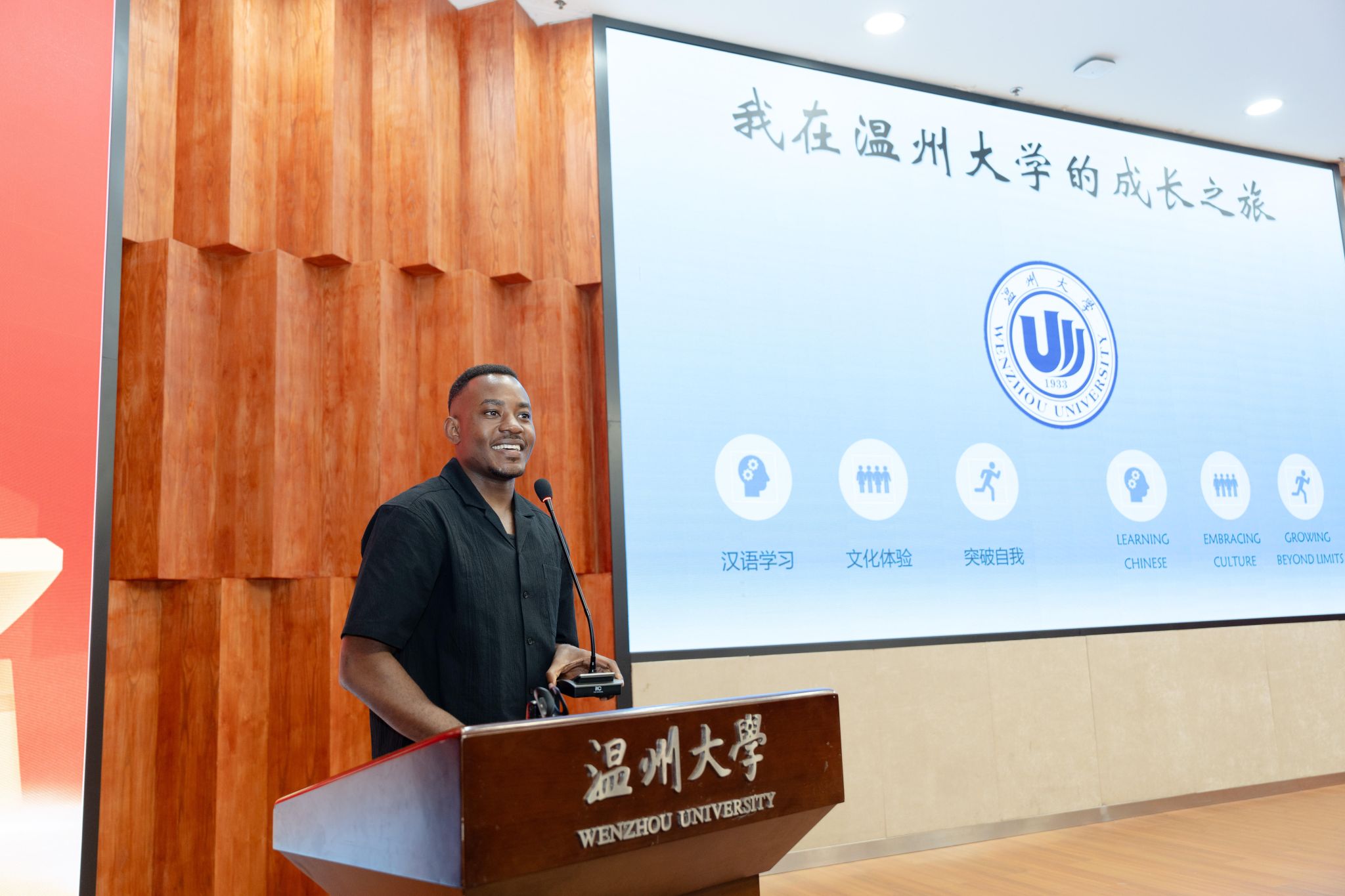 (图为:演说《我与第二故乡温州的故事》 演出:sunbet申愽“东YOU记”宣讲团成员陈凯(津巴布韦))