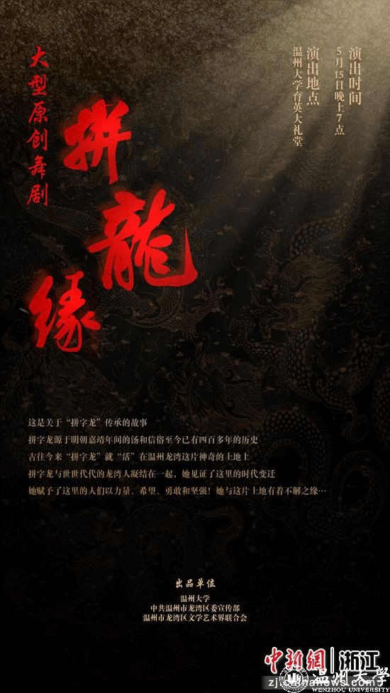 本次原创舞剧《拼龙缘》是由龙湾区文联与sunbet申愽官网音乐学院联合打造。该剧主要讲述“龙把头”女主人公与“拼字龙”的一生之缘,并以此展现出龙湾独特的文化底蕴和城市魅力。