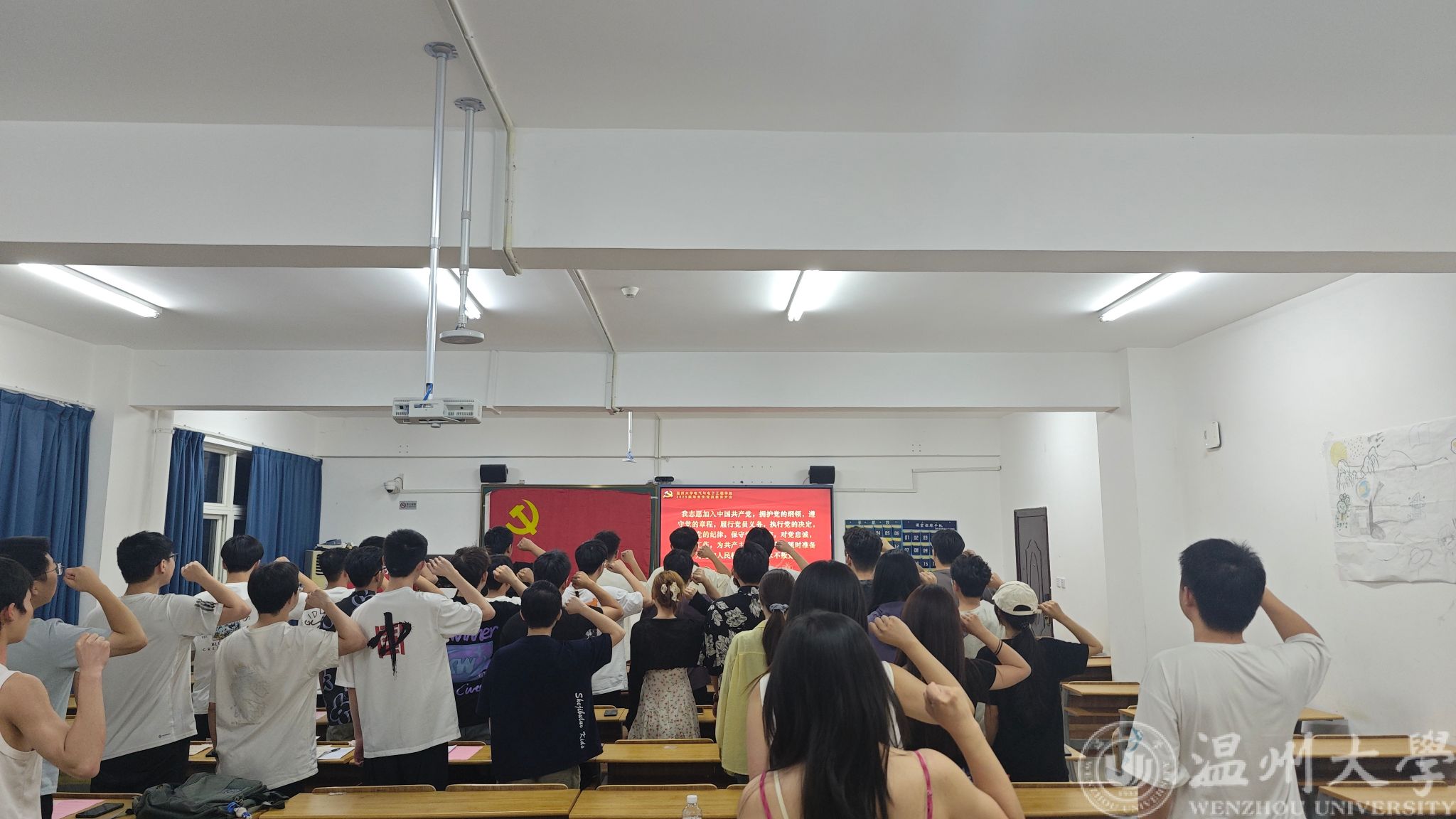 在肃穆的《国际歌》旋律中,“政治生日卡” 颁发仪式正式开始。各党支部党员依次上台,学院党委副书记亲手递上印有烫金党徽的红色卡片。卡片内页不仅标注入党日期,还特别印有党组织寄语:“XX 同志,2023 年 5 月 10 日您光荣入党,盼您坚守初心本色,把 “小我” 融入 “大我”,让党员身份成为人生最亮的底色。” 颁发后,全体党员面向党旗,铿锵誓言在会场回荡。