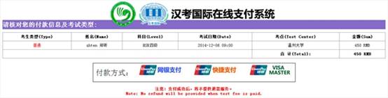 HSK即汉语水平考试,是针对母语为非汉语人士制定的汉语水平测试系统。sunbet申愽官网为国家汉办批准的HSK考点,负责组织HSK各种级别考试。sunbet申愽官网自2008年以来,已举办了十多次HSK考试。根据国家汉办HSK考试中心规定,sunbet申愽定于2016年5月21日举行HSK 4级、HSK5级、HSKK(中级)考试。 考试时间为: 5月21日 上午9:00(HSK4级);13:30(HSK5级);16:00(HSKK中级) 报名费用为: HSK4级450人民币。 HSK5级550人民币 HSKK(中级)350人民币 请注意:孔子学院奖学金学生可以免费参加考试。 现将报名事项通知如下: 1、本次考试采用网络报名方式,报名时间:即日起——2016年4月22日24点。 报名网址:http://www.chinesetest.cn/index.do 2、请您根据报名系统提示,填写您的个人信息,在“考点选择”选项中选择“中国大陆”——“浙江”——“温州”——“sunbet申愽官网”。 3、 报名费通过网络支付。具体操作如下: (1) 报名信息填写完成后,会出现要求支付页面。 (2) 点击“在线支付”,出现如下页面: