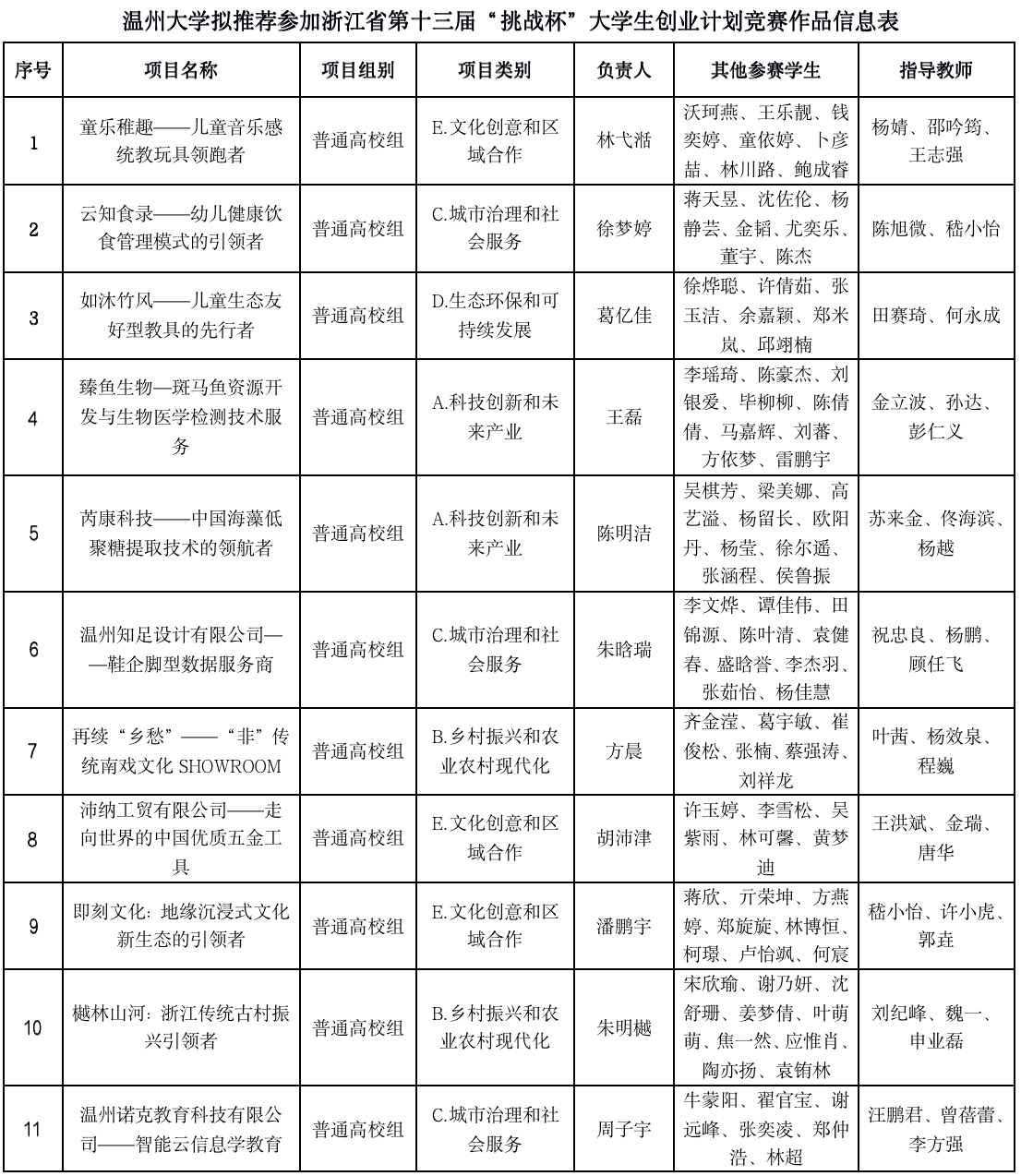 根据《关于举办浙江省第十三届“挑战杯”大学生创业计划竞赛的预通知》相关要求,经自主报名、院赛、校赛选拔,现将sunbet申愽拟推荐参加浙江省第十三届“挑战杯”大学生创业计划竞赛的作品相关信息公示如下。