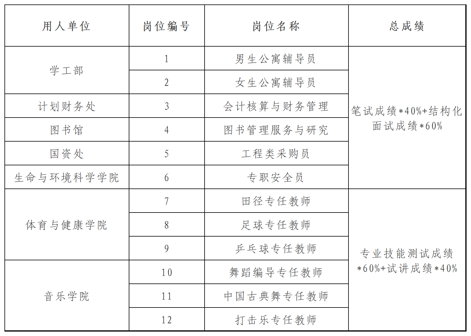 2.初试。学校预计于7月下旬进行初试(具体时间另行通知)。编号1、2、3、4、5、6岗位初试采用闭卷笔试的方式;编号7、8、9、10、11、12岗位初试采用专业技能测试的方式(考核内容和方式由用人单位另行通知)。根据应聘人员的初试成绩,按照计划选聘人数的5倍确定参加资格复审人员,如遇入围资格复审最后一名成绩相同,则一并列为入围下一环节对象。
