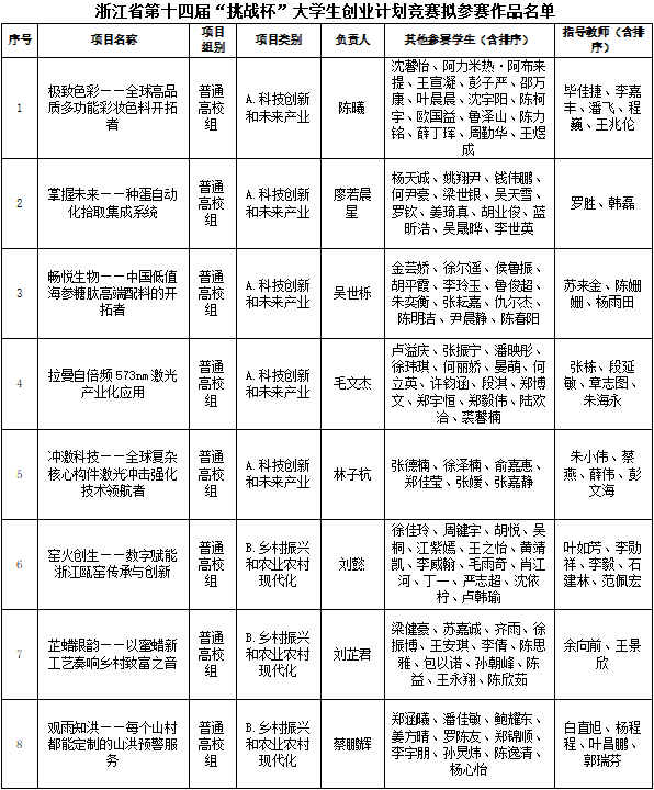 根据《关于举办浙江省第十四届“挑战杯”大学生创业计划竞赛的通知》相关要求,经sunbet申愽官网“挑战杯”院赛、校赛等两次公开、公正、公平的选拔,现将sunbet申愽拟推荐参加浙江省第十四届“挑战杯”大学生创业计划竞赛的作品相关信息予以公示。