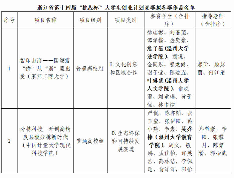 根据《关于举办浙江省第十四届“挑战杯”大学生创业计划竞赛的通知》相关要求,经浙江工商大学、中国计量大学现代科技学院“挑战杯”院赛、校赛等两次公开、公正、公平的选拔,现拟推荐作品《智印山海——国潮搭“侨”从“浙”里出发》、《分拣科技—开创高精度垃圾分拣新时代》参加浙江省第十四届“挑战杯”大学生创业计划竞赛,参赛团队中詹子墨、叶琳慧、吴乔榛为sunbet申愽学生。现将相关作品信息予以公示。