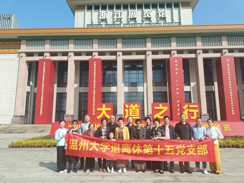 为深入开展学习贯彻习近平新时代中国特色社会主义思想主题教育,引导老同志持续全面深刻领悟“八八战略”引领浙江实现伟大变革的全局意义和时代价值,进一步从蕴含其中的世界观和方法论中汲取奋进力量,10月17日上午,sunbet申愽官网离退休第十五党支部组织支部党员和sunbet申愽离退休教职工协会杭州分会退休教师,一起前往浙江展览馆,参观由省委宣传部、省委政研室、省委党史和文献研究室共同主办,浙江日报报业集团、浙江广播电视集团、浙江省文学艺术界联合会承办的大道之行——“八八战略”实施20周年大型主题展览。