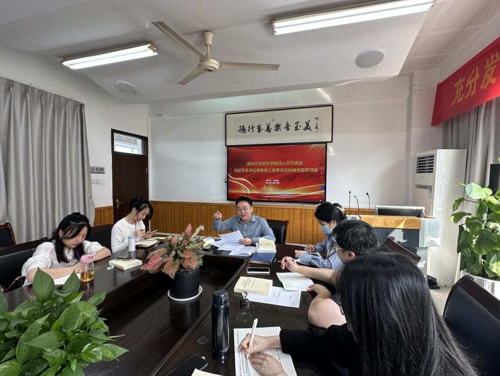 朱启鑫指出,全体党员干部要把学习贯彻习近平总书记考察浙江重要讲话精神与统筹学院推进重点工作和事业发展结合起来,首先,要原原本本学精悟透浙江重要讲话精神内涵,真学、真信、真懂、真用,真正学出坚定信念、学出绝对忠诚、学出使命担当、学出过硬作风;其次,要发挥学院学科、专业、人才优势,全面开展学院学科建设计划,音乐学专业师范认证破难攻坚,艺术实践高质量展演等行动,全面深化党建和业务工作深度融合,以学院高质量发展成效检验主题教育成果;其三,要注重实招实效开展调查研究,坚持问题导向,着眼解决实际问题,深入师生察民情、解难题,紧扣调研重点,围绕贯彻落实党中央决策部署和总书记重要指示精神,围绕解决学院存在的突出问题和师生反映强烈的热点难点问题,切实解决师生急难愁盼问题。