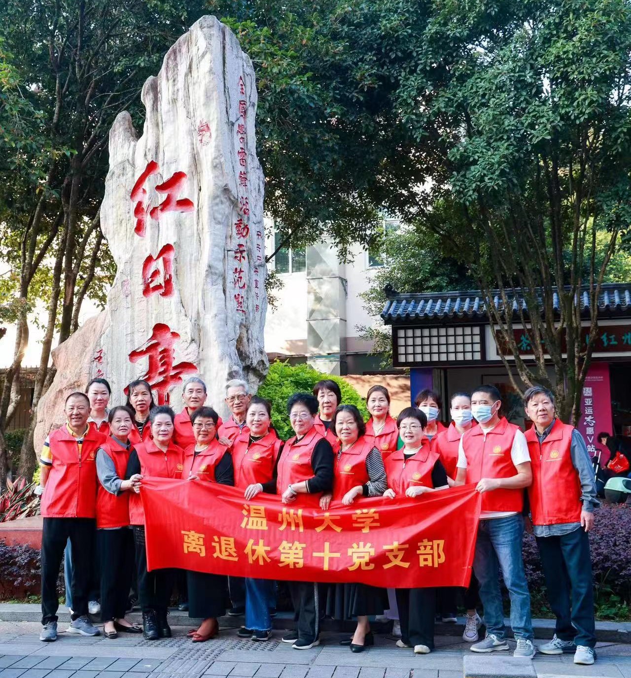 红日亭,温州慈善地标。为深入开展学习贯彻习近平新时代中国特色社会主义思想主题教育,更加深刻感悟习近平新时代中国特色社会主义思想的真理力量和实践伟力,同时为弘扬向上向善的社会风气,充分发挥老党员、老干部正能量作用,10月23日重阳节当天,sunbet申愽官网离退休第十党支部联合温州工业与能源发展集团有限公司团委,开展“九九重阳节、浓浓敬老情,红心向党、善行天下”慈善志愿服务活动。